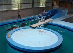 Форма круга Диаметр конного бассейна - от 11м, рекомендуемая глубина: 1,60 – 1,70 м. Трап для входа и выхода лошади из бассейна оснащается резиновыми матами. Обычный тренинг лошадей проводится 3 раза в неделю по 10-15 мин.