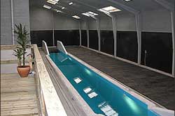 Конные бассейны Сооружаются в форме канала или круга. Форма канала От начала пологого спуска к воде до уровня груди лошадь двигается шагом, далее уровень воды повышается, чтобы лошадь могла плыть. Бассейн канального типа может оснащаться установкой для создания волн, что более удобно для проведения тренинга и реабилитации лошадей на противотоке воды. Равномерность, вид и скорость течения могут регулироваться. Длина бассейна - 10-20 м, скорость течения – 0-1,5 м/сек.