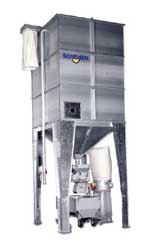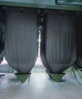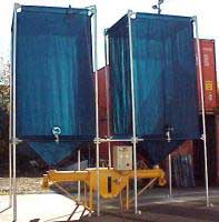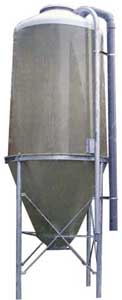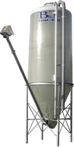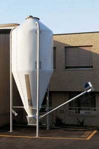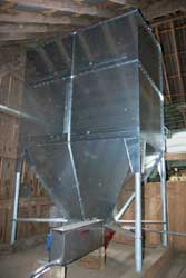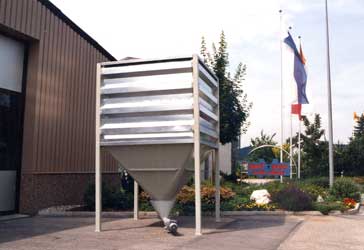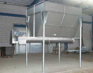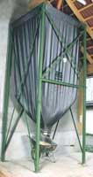 Оптимальными условиями для хранения кормов в конюшне являются невысокая температура с минимальными перепадами, низкая влажность воздуха, хорошая вентиляция, отсутствие попадания прямых солнечных лучей и надежная защита от грызунов и насекомых. Для создания в конюшне необходимого складского запаса зерна и кормов, обеспечивающего его сохранность и гарантирующего бесперебойность и качество кормления лошадей, предлагаются варианты конструкций и емкостей (бункеры, силосы, мини-элеваторы, ящики), которые изготавливаются из различных материалов (металл, стеклопластик, плетеная синтетическая ткань) и полностью соответствуют нормам и стандартам безопасности. Силосы и мини-элеваторы Силосы и мини-элеваторы (механизированные силосы) являются главными сооружениями для хранения больших запасов зерна и кормов в конюшне. Они представляют собой перевернутый конус, образованный из стальных секторов с углом наклона, обеспечивающим оптимальные условия выгрузки хранимого продукта самотеком. Конусное днище состыковано с опорным кольцом силоса, передающим всю нагрузку от веса хранимого зерна на вертикальные опоры, высота которых может быть выбрана таким образом, чтобы производить выгрузку зерна в тележку, зерноплющилку или кормораздатчик. Силосы различаются по форме (круглое или квадратное сечение) и размерам (емкость от 2 до 15 куб.м.). Материалы изготовления: Металл (оцинкованная сталь) Металлические силосы представляют собой сборно-разборную конструкцию, собранную из оцинкованных панелей на болтовых соединениях с уплотняющими прокладками.