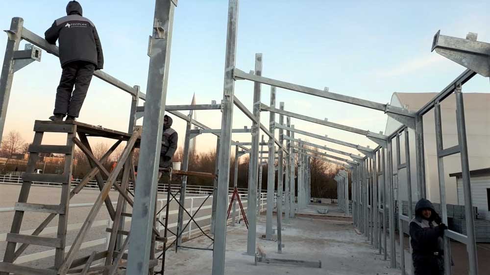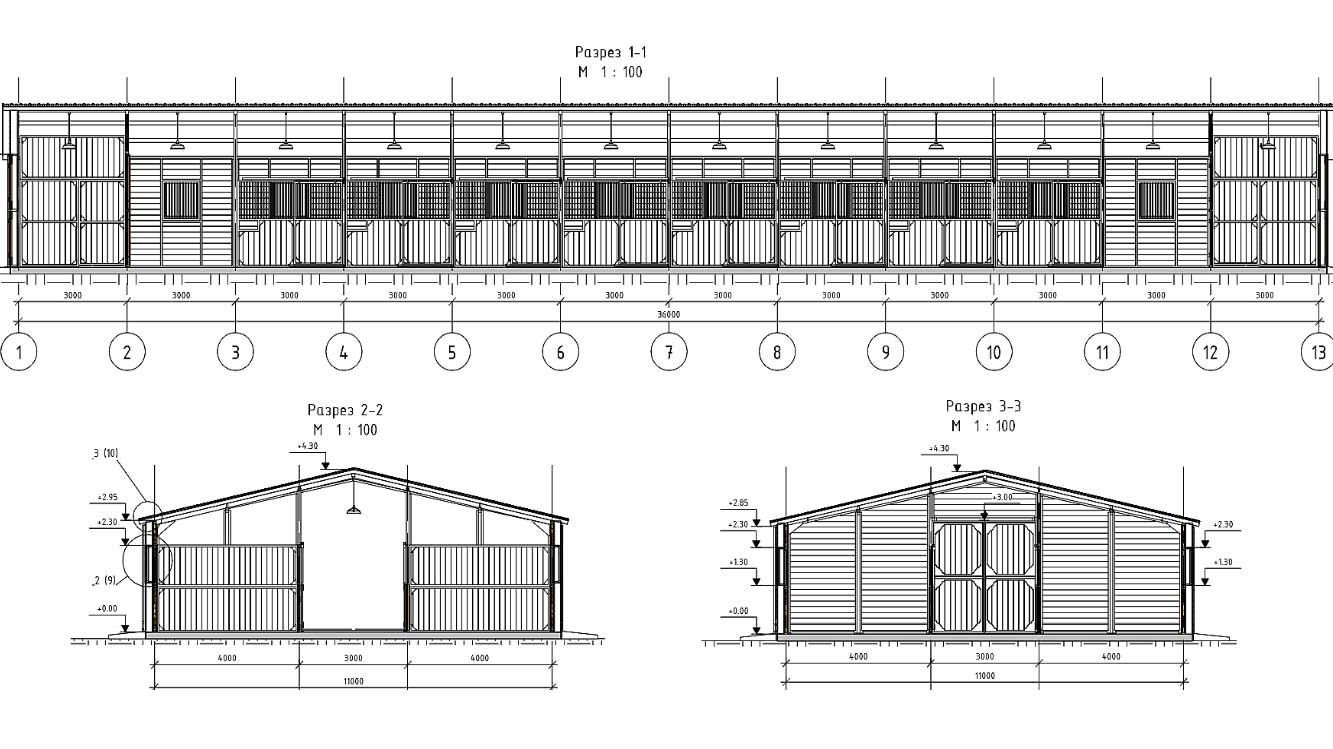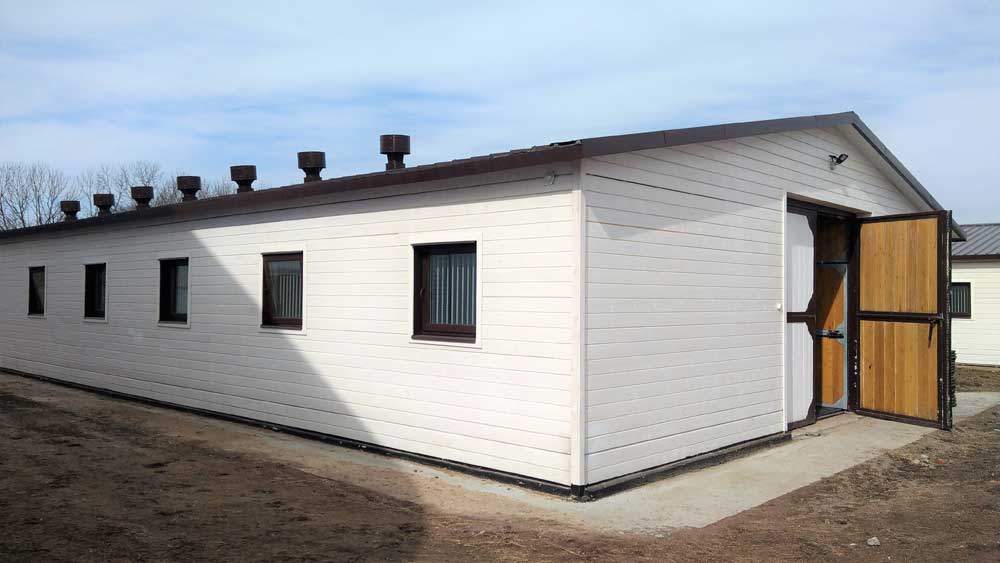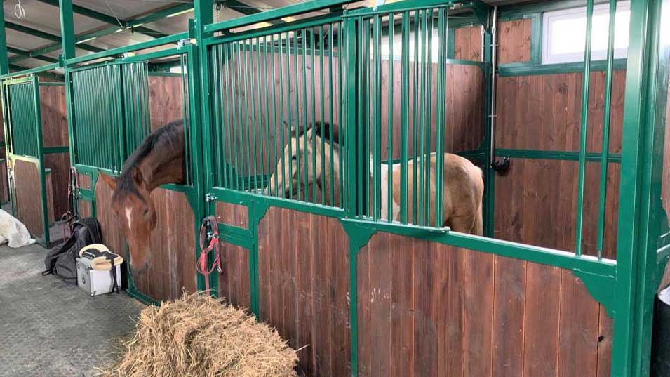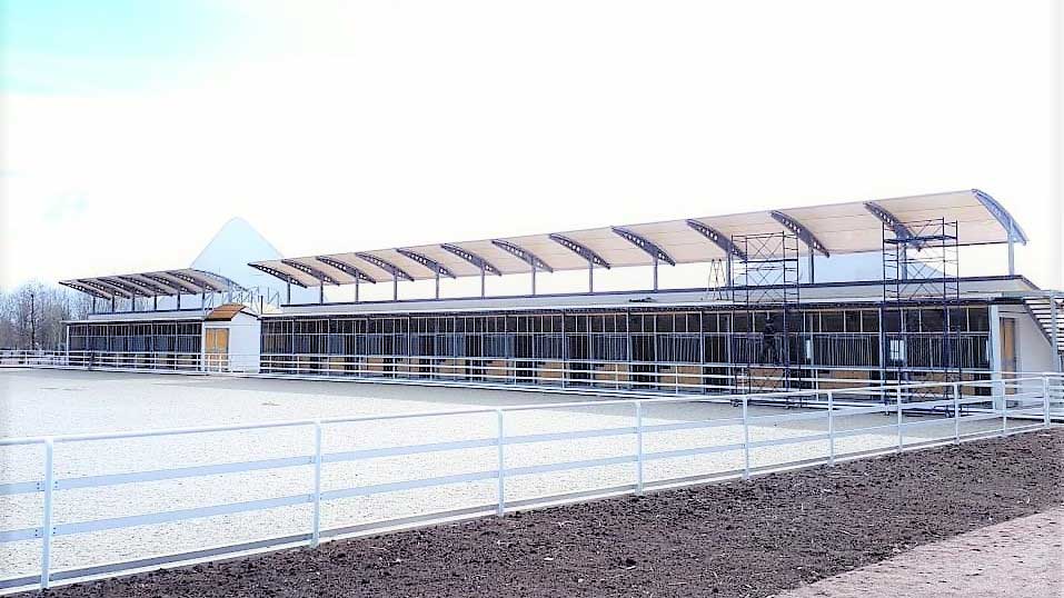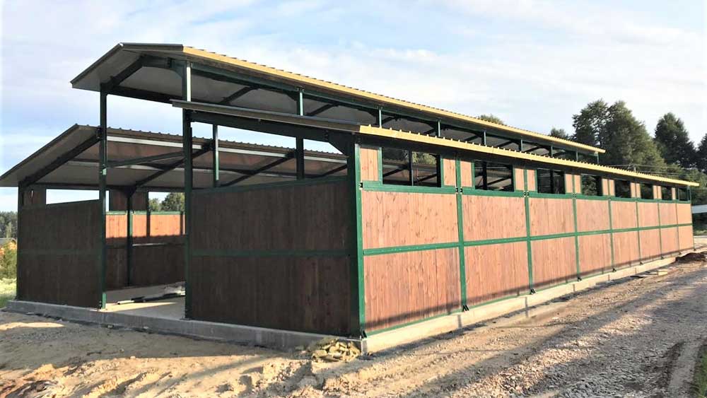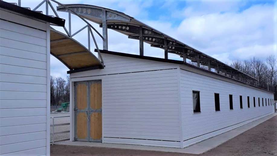 Основные сведения Модульная конюшня производства ЦКТ «Эквиплан» представляет собой изделие заводского изготовления сборно-разборного типа для содержания и обслуживания лошадей в конноспортивных комплексах, коневодческих предприятиях, крестьянских фермерских хозяйствах и т.д. Изделие относится к мобильным, временно устанавливаемым (НЕКАПИТАЛЬНЫМ) сооружениям, а следовательно, не требуется разработка проекта, получения разрешения на строительство и ввод строения в эксплуатацию. Изготовление модульной конюшни осуществляется на производственной базе ЦКТ «Эквиплан» в соответствии с ТУ 25.11.10-11-42439974-2017. Все материалы, применяемые в изделии, имеют государственные сертификаты соответствия ГОСТ и разрешены к применению на территории Российской Федерации. Модульная конюшня состоит из металлического каркаса, ограждающих кровельных и стеновых конструкций, внутри разделено на индивидуальные секции (денники) для лошадей, подсобные и вспомогательные помещения. В зависимости от условий содержания лошадей, конюшня может быть предназначена для летней или круглогодичной эксплуатации, иметь холодное или утепленное исполнение соответственно. Металлокаркас сборно-разборный, на болтовых соединениях, может быть окрашен порошковой краской в любой цвет RAL или оцинкован. В качестве заполнения стен и перегородок может использоваться подготовленная деревянная или цельнопластиковая доска. В производстве применяются хвойные породы дерева - сосна и лиственница, сорта АВ с завальцованными углами. Доска пропитана колорирующим антисептиком, безопасным для животных. Возможно изготовление вентиляционных прозоров в доске. Секции денников разработаны с учетом стандартов безопасности лошади, применяемых ведущими европейскими производителями, и имеют различные варианты исполнения. Фронтальные секции могут быть выполнены с откатными или распашными дверьми, которые в свою очередь могут иметь цельную решетку или распашную фрамугу. Для кормушки во фронтальной секции предусмотрен проем или распашная дверца. Место в деннике под кормушкой может быть занято индивидуальным органайзером. Разделительная секция между денниками может быть заполнена доской полностью, либо пополам/на треть с решеткой. Крыша — кровельная сэндвич-панель с утеплением базальтовой ватой. В круглогодичном исполнении каркас конюшни обшивается системой минераловатного утепления. В качестве облицовки стен применяется имитатор бруса или металлический сайдинг. Для теплоизоляции рекомендуется комплектовать конюшню в торцах тамбурами, отсеченными от основного помещения дополнительными воротами. Для циркуляции воздуха в кровле устанавливаются вентиляционные проходы. Конюшня в круглогодичном исполнении комплектуется окнами. Они могут быть квадратными на высоте 1,6м от пола и комплектоваться металлической решеткой, либо прямоугольными, на высоте 2,2м от пола – без решеток. В летнем исполнении конюшня может не комплектоваться тамбурами, воротами, окнами и вентпроходами. Также на кровле возможна замена сэндвич-панели на профилированный лист. В настоящий момент доступны 4 типа конюшен: 2. Модульная конюшня, тип «Ф» 3. Модульная конюшня-трибуна, тип «Т» 4. Модульная конюшня-летник, тип «Л» 1. Модульная конюшня, тип «A» Каркасная модульная конюшня типа «А» имеет двускатную 