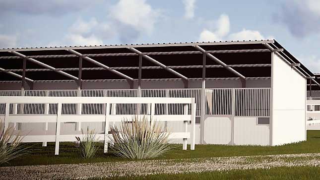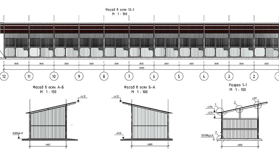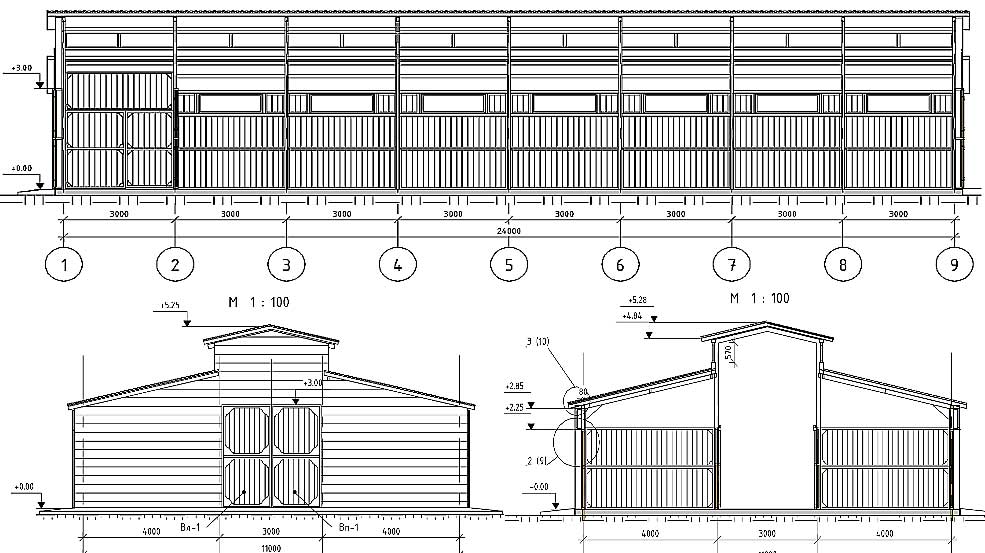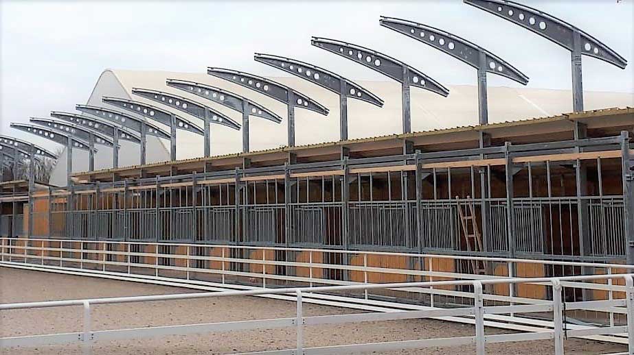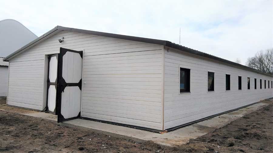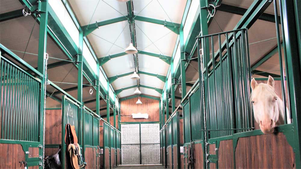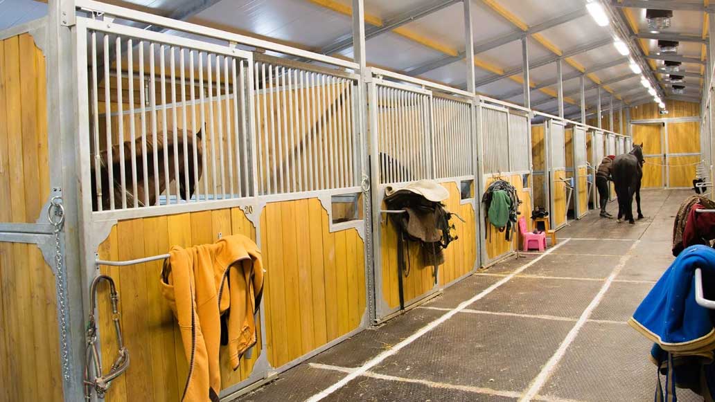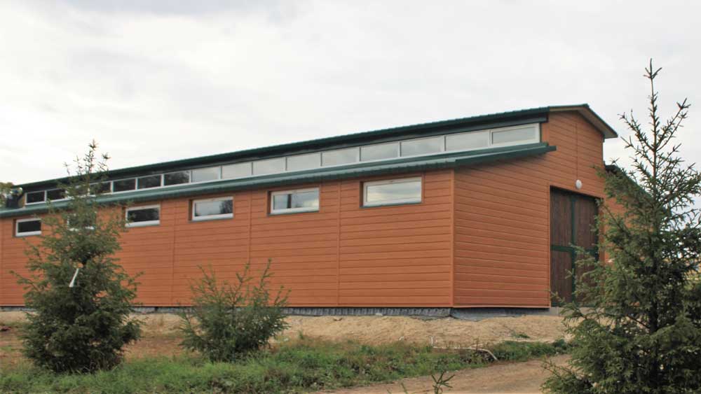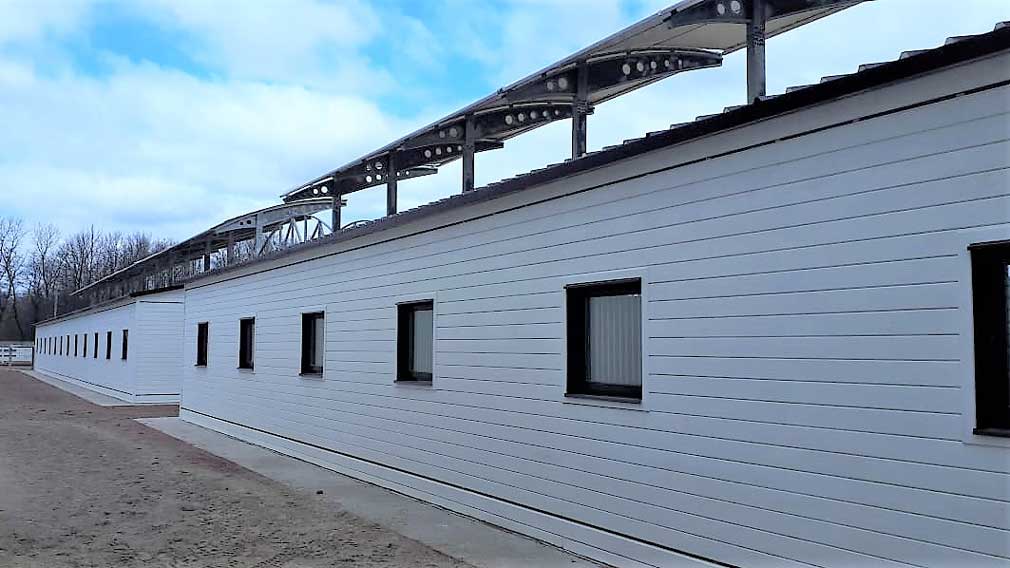Основные сведения Модульная конюшня производства ЦКТ «Эквиплан» представляет собой изделие заводского изготовления сборно-разборного типа для содержания и обслуживания лошадей в конноспортивных комплексах, коневодческих предприятиях, крестьянских фермерских хозяйствах и т.д. Изделие относится к мобильным, временно устанавливаемым (НЕКАПИТАЛЬНЫМ) сооружениям, а следовательно, не требуется разработка проекта, получения разрешения на строительство и ввод строения в эксплуатацию. Изготовление модульной конюшни осуществляется на производственной базе ЦКТ «Эквиплан» в соответствии с ТУ 25.11.10-11-42439974-2017. Все материалы, применяемые в изделии, имеют государственные сертификаты соответствия ГОСТ и разрешены к применению на территории Российской Федерации. Модульная конюшня состоит из металлического каркаса, ограждающих кровельных и стеновых конструкций, внутри разделено на индивидуальные секции (денники) для лошадей, подсобные и вспомогательные помещения. В зависимости от условий содержания лошадей, конюшня может быть предназначена для летней или круглогодичной эксплуатации, иметь холодное или утепленное исполнение соответственно. Металлокаркас сборно-разборный, на болтовых соединениях, может быть окрашен порошковой краской в любой цвет RAL или оцинкован. В качестве заполнения стен и перегородок может использоваться подготовленная деревянная или цельнопластиковая доска. В производстве применяются хвойные породы дерева - сосна и лиственница, сорта АВ с завальцованными углами. Доска пропитана колорирующим антисептиком, безопасным для животных. Возможно изготовление вентиляционных прозоров в доске. Секции денников разработаны с учетом стандартов безопасности лошади, применяемых ведущими европейскими производителями, и имеют различные варианты исполнения. Фронтальные секции могут быть выполнены с откатными или распашными дверьми, которые в свою очередь могут иметь цельную решетку или распашную фрамугу. Для кормушки во фронтальной секции предусмотрен проем или распашная дверца. Место в деннике под кормушкой может быть занято индивидуальным органайзером. Разделительная секция между денниками может быть заполнена доской полностью, либо пополам/на треть с решеткой. Крыша — кровельная сэндвич-панель с утеплением базальтовой ватой. В круглогодичном исполнении каркас конюшни обшивается системой минераловатного утепления. В качестве облицовки стен применяется имитатор бруса или металлический сайдинг. Для теплоизоляции рекомендуется комплектовать конюшню в торцах тамбурами, отсеченными от основного помещения дополнительными воротами. Для циркуляции воздуха в кровле устанавливаются вентиляционные проходы. Конюшня в круглогодичном исполнении комплектуется окнами. Они могут быть квадратными на высоте 1,6м от пола и комплектоваться металлической решеткой, либо прямоугольными, на высоте 2,2м от пола – без решеток. В летнем исполнении конюшня может не комплектоваться тамбурами, воротами, окнами и вентпроходами. Также на кровле возможна замена сэндвич-панели на профилированный лист. В настоящий момент доступны 4 типа конюшен: 2. Модульная конюшня, тип «Ф» 3. Модульная конюшня-трибуна, тип «Т» 4. Модульная конюшня-летник, тип «Л» 1. Модульная конюшня, тип «A» Каркасная модульная конюшня типа «А» имеет двускатную 